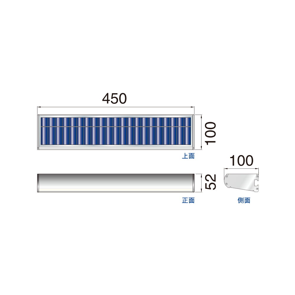 - サイズ450×100×52mm、ソーラーパネル+バッテリー+本体の オールインワン構造で、多様な場所へ設置可能です。