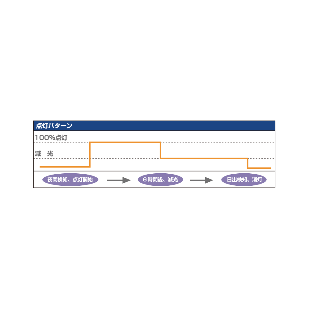 - 夜間点灯、6時間後減光(約1/6)し、日出検出まで発光