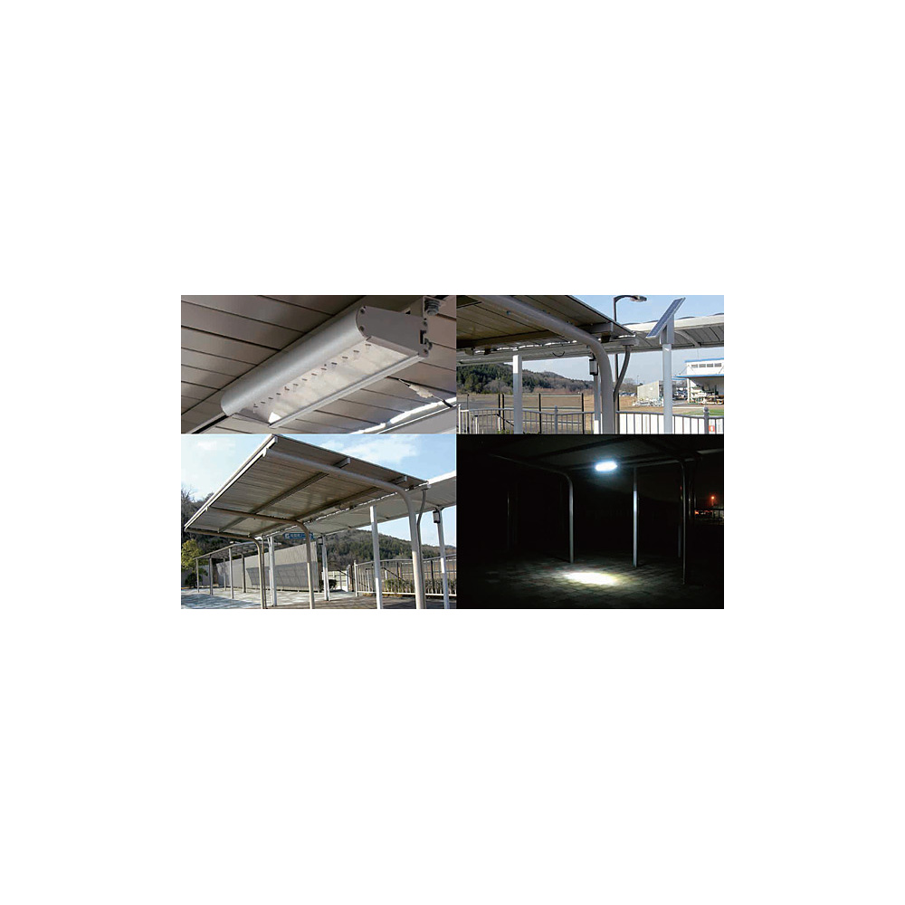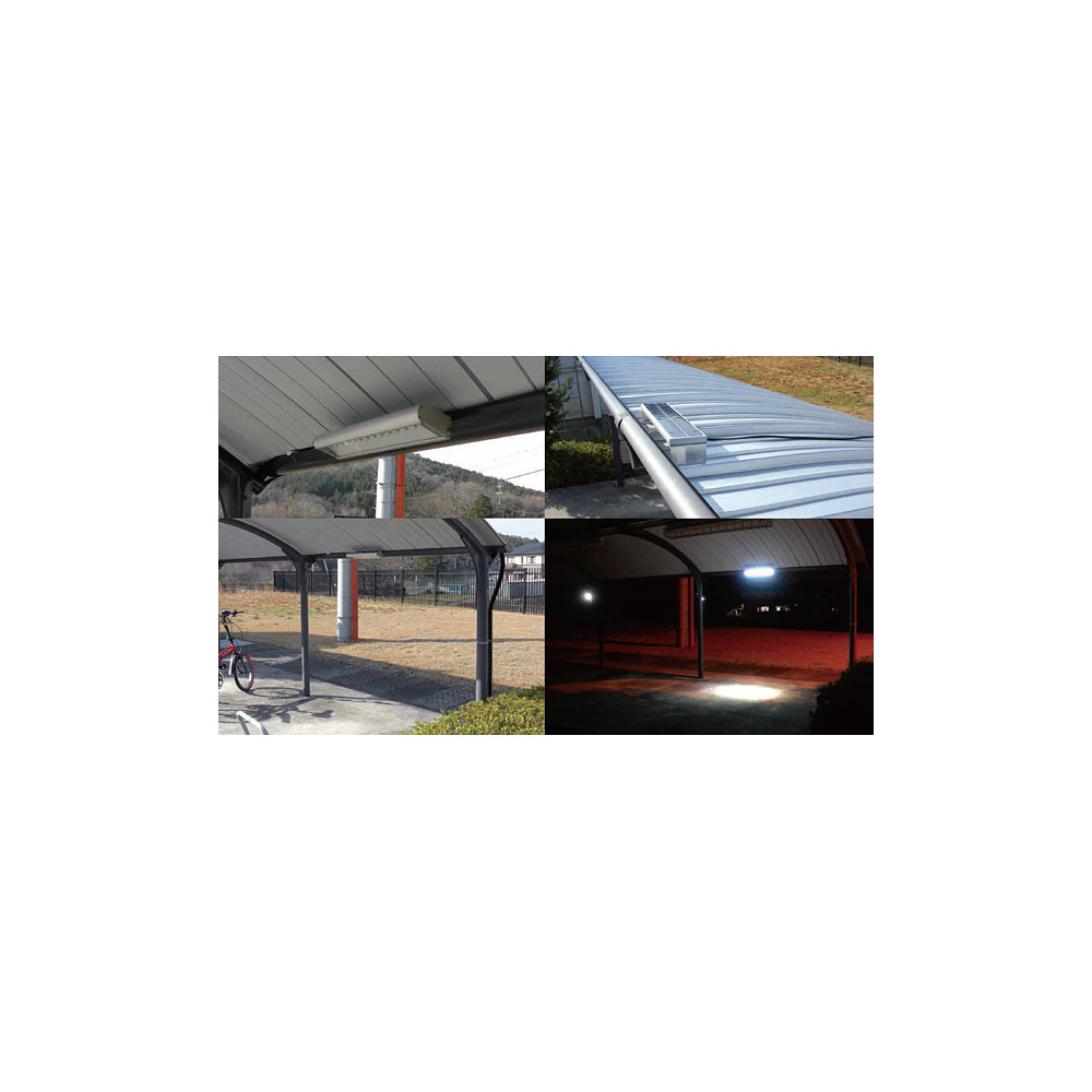 - 自転車用シェルターの下や日照が不足する場所にも設置可能な、ソーラーパネルと発光部を分離構造とした簡易照明です
