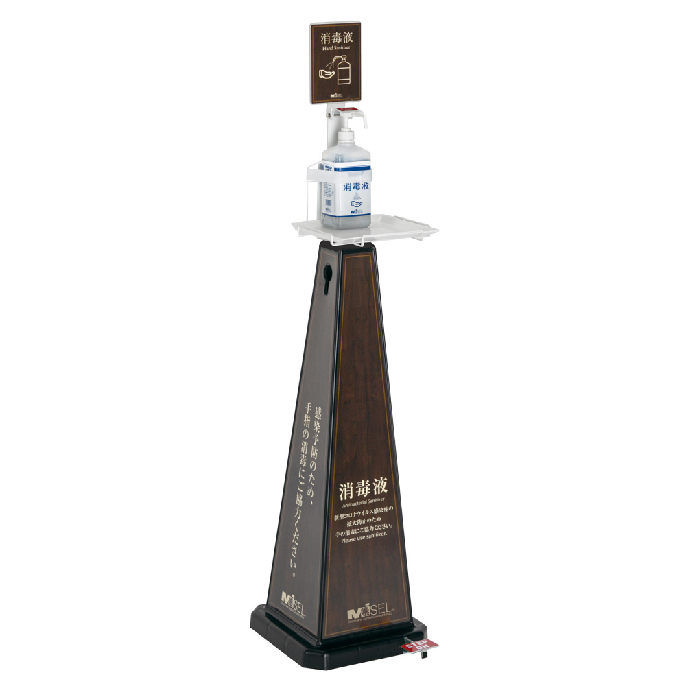 - テラモト製 ミセル・メッセージポールとアルコール消毒液置き台がひとつになった消毒液スタンド。