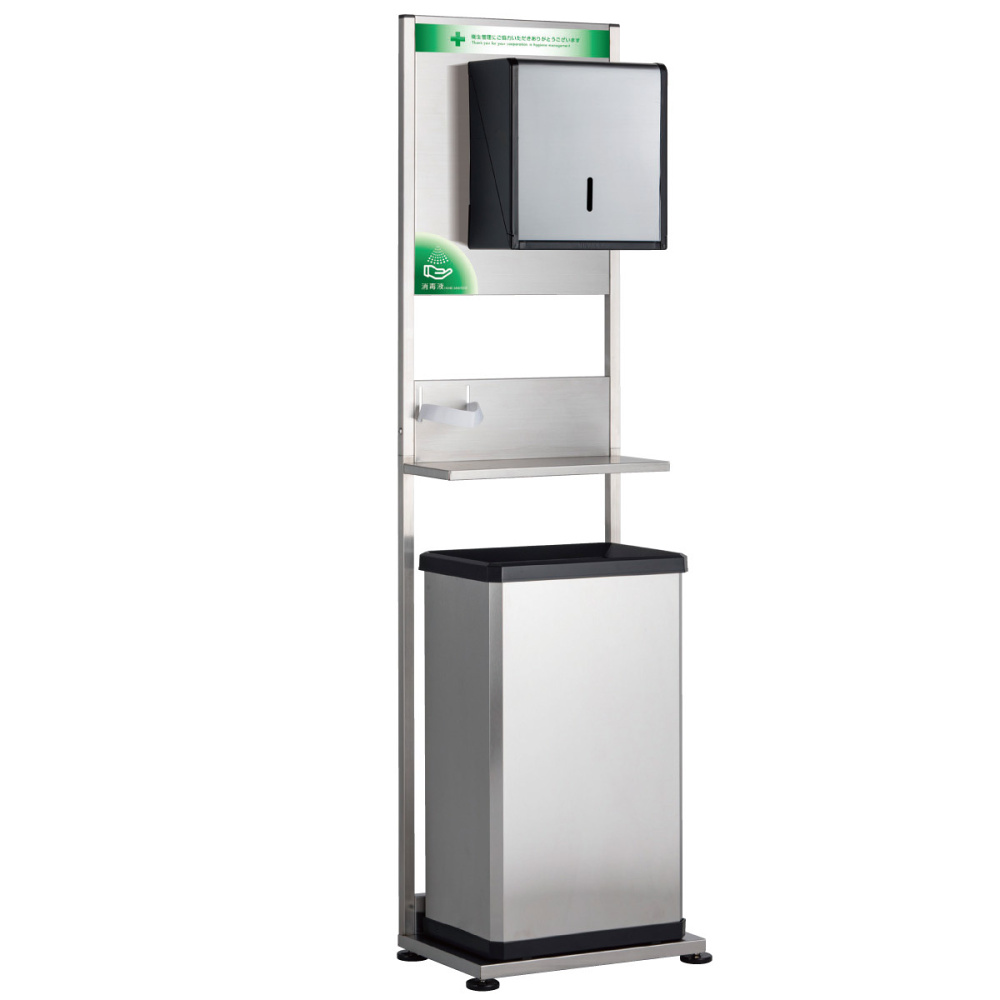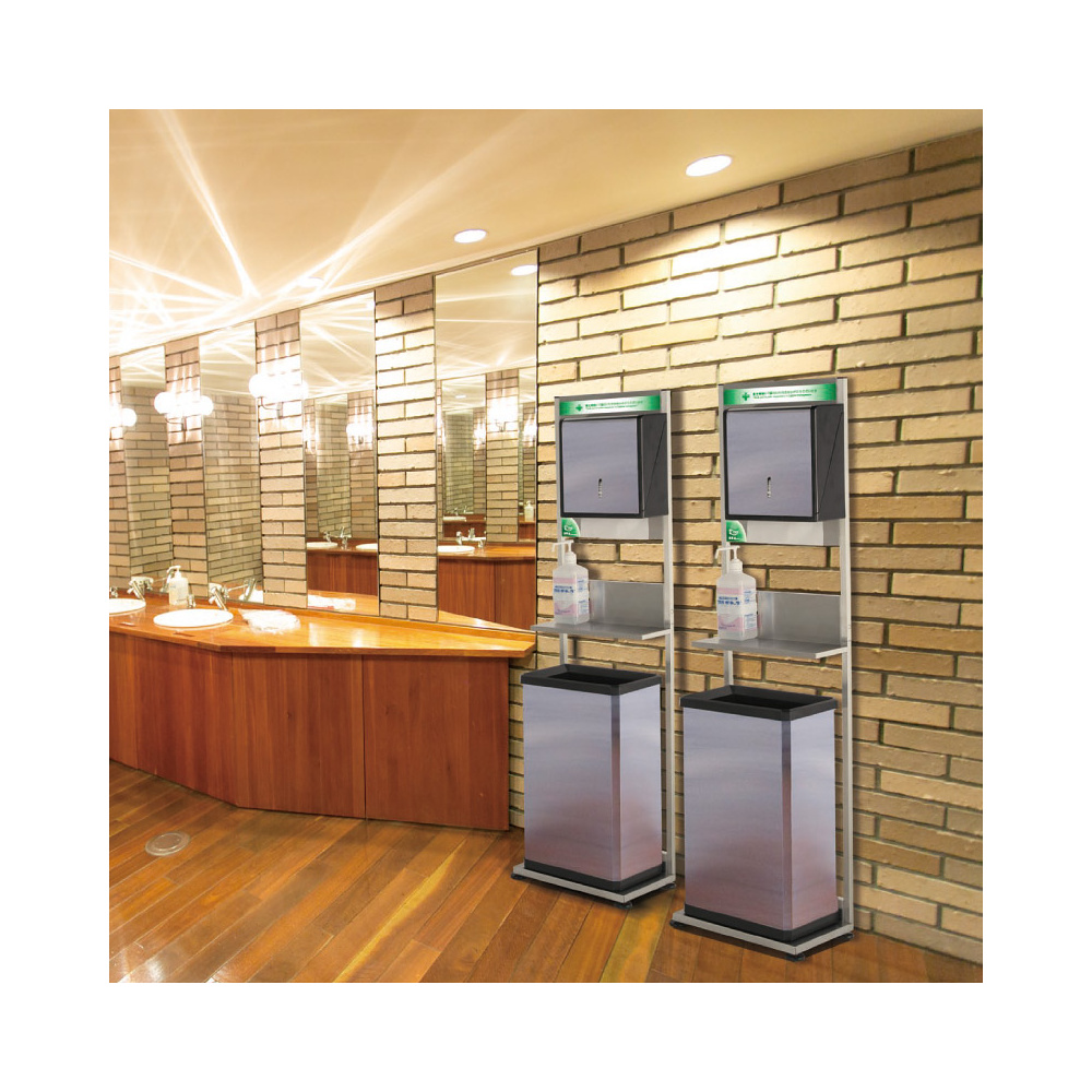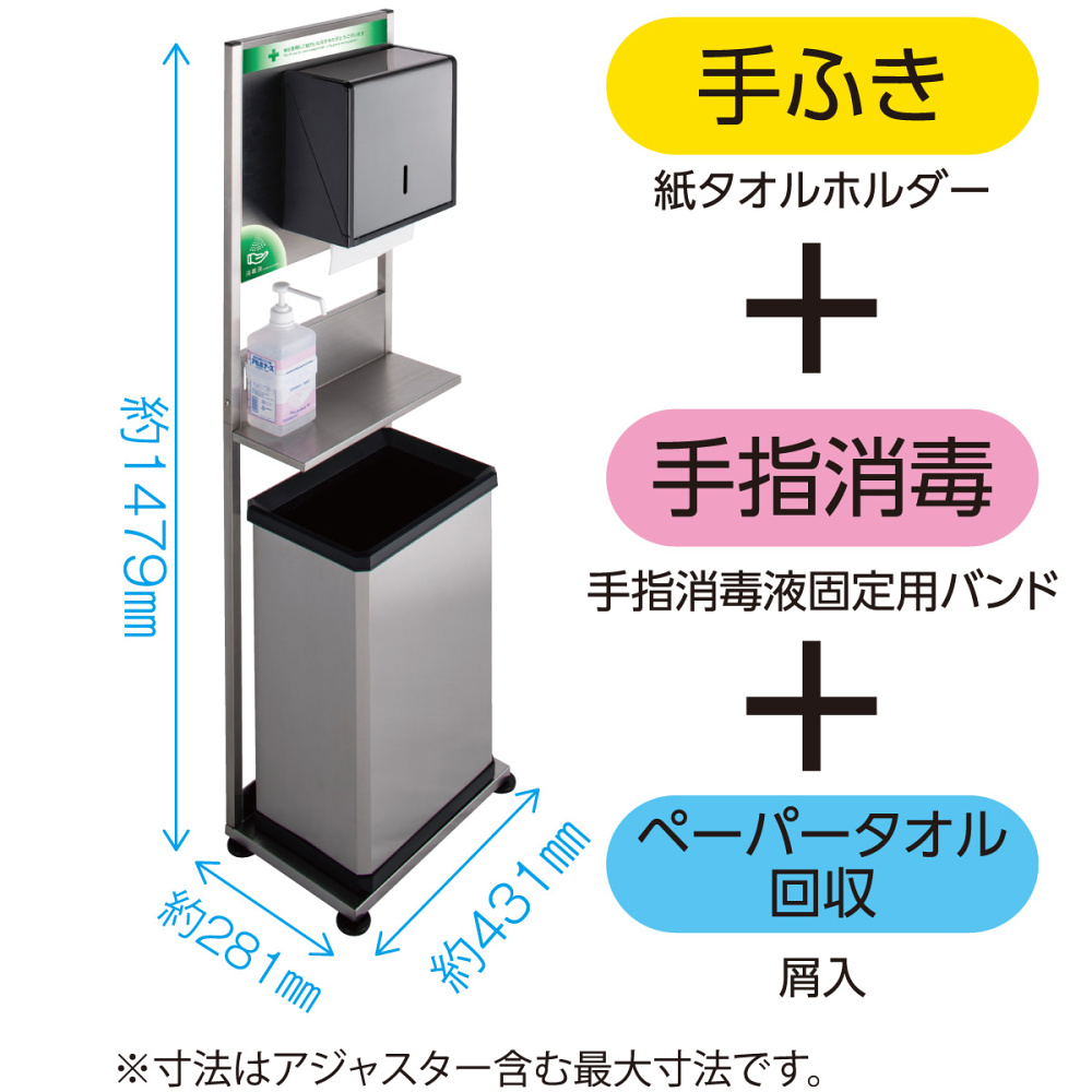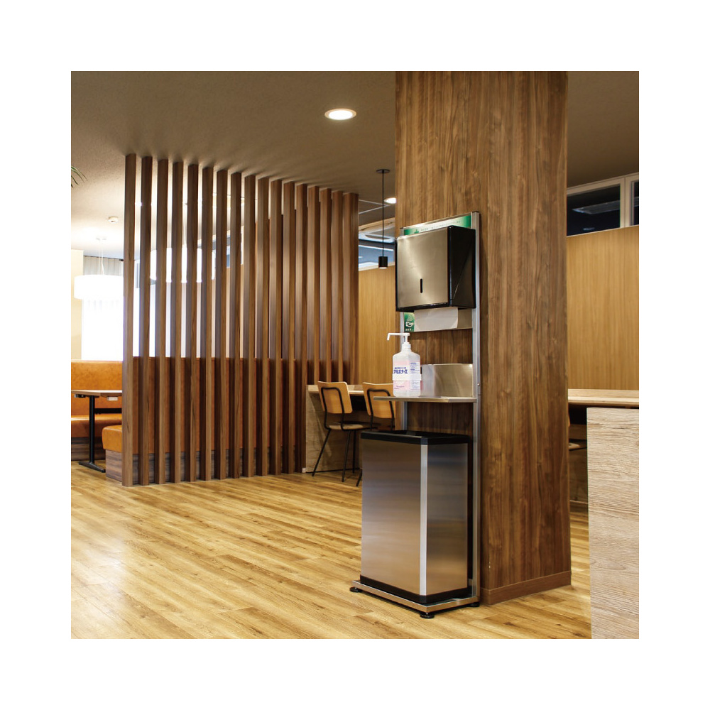 - これ1台で手ふき・手指消毒・ペーパータオル回収が一度に!置くだけかんたん感染症対策スタンド。