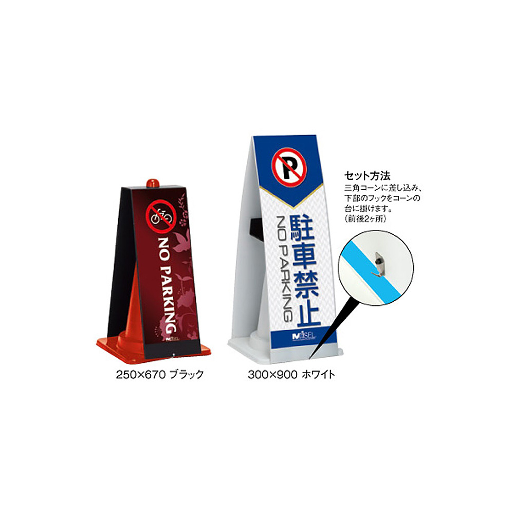 ■コーンメッセのセット方法。三角コーンに差し込み、下部にあるフックを三角コーンの台に掛けます。