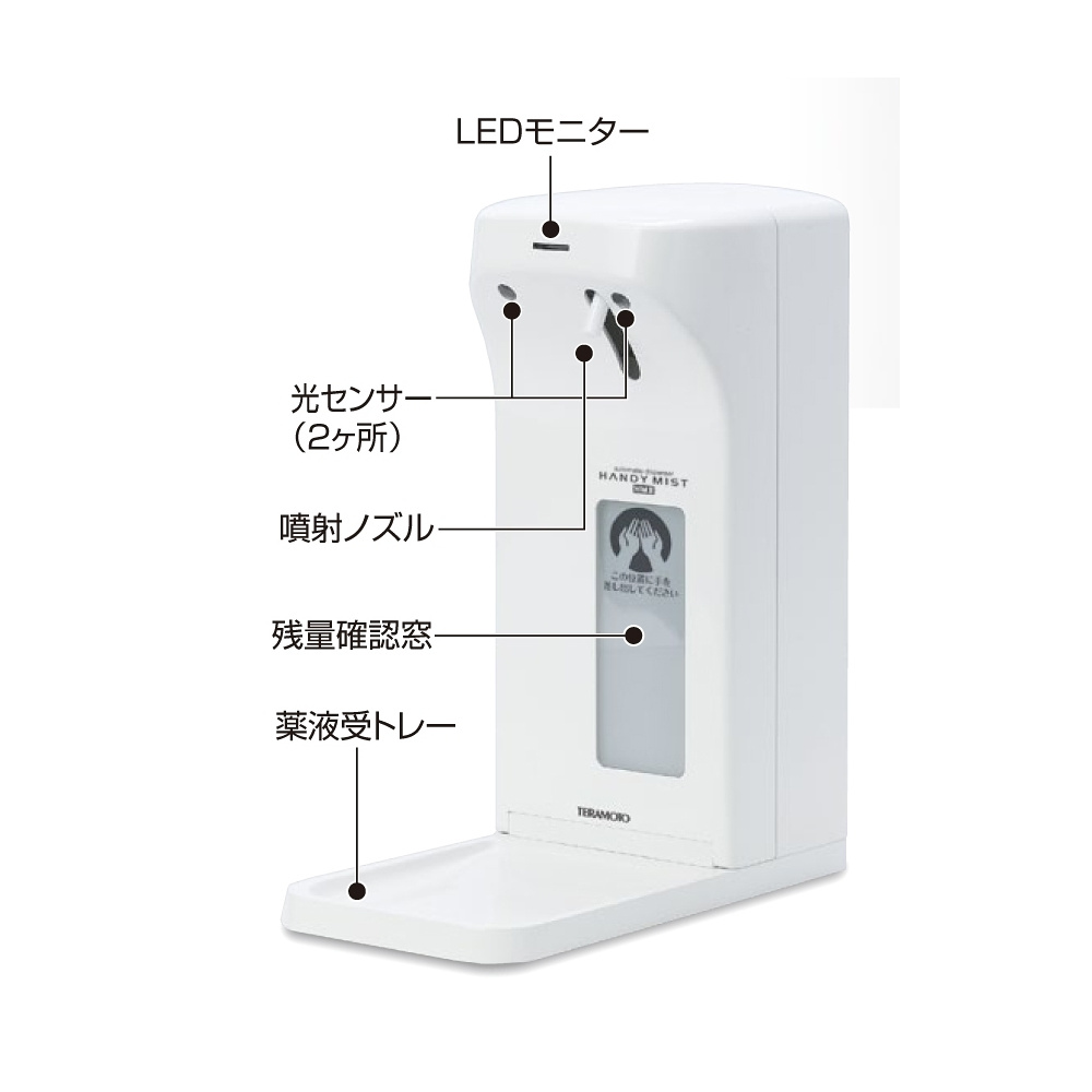 - 手のひらを噴射ノズルの下に近づけると光センサーが 感知し、薬液を自動噴射するので、消毒器に直接手を触れることなく衛生的に使用できます。