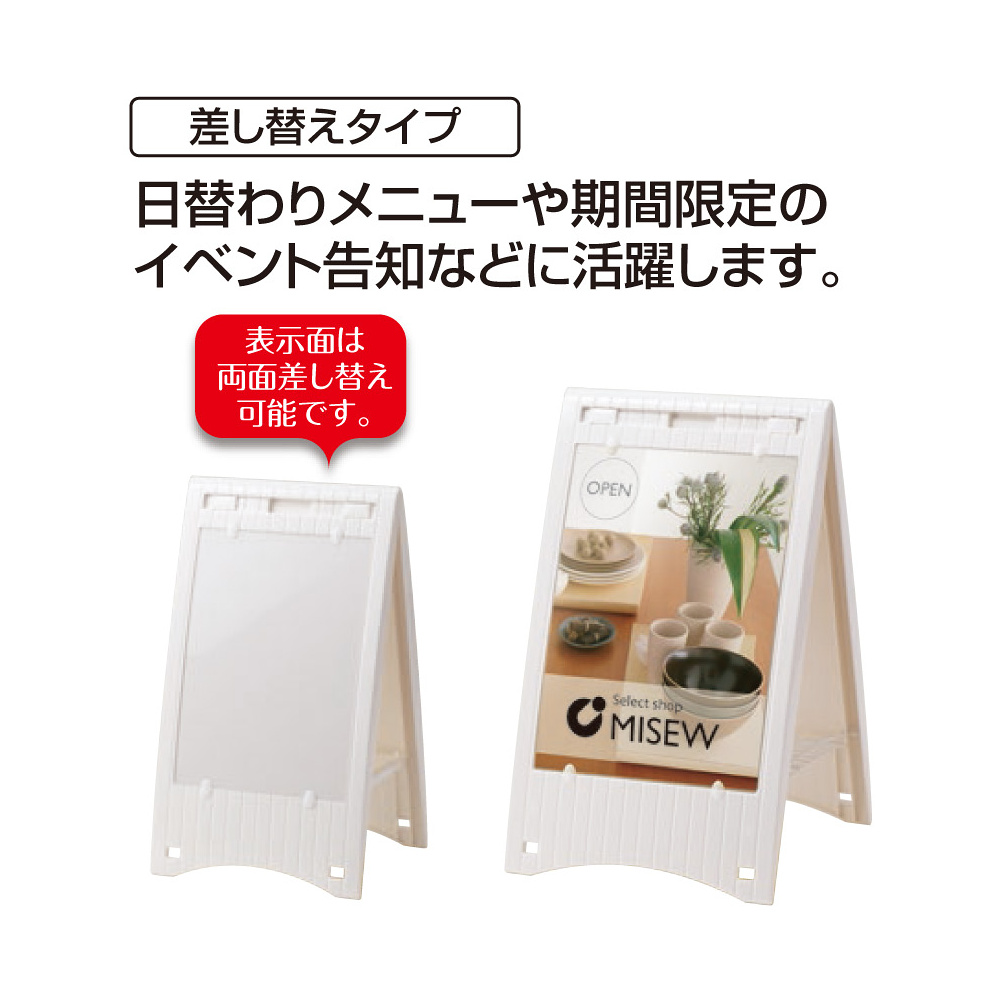 表示面の差し替えができるタイプで、日替わりメニューや期間限定のイベント告知など様々にお使いいただけます。