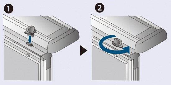 - ガタ付きを無くした2枚1組の吊金具は、特殊工具無 しで簡単にセットでき、板面をしっかりと固定します。
