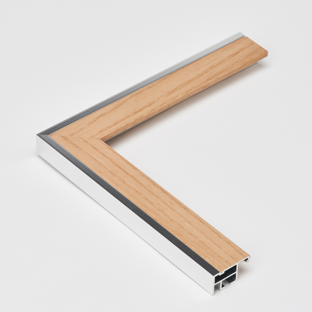- 木目の柔らかい色の横に、アルミの素材感を活かした光沢シルバーの組み合わせ。