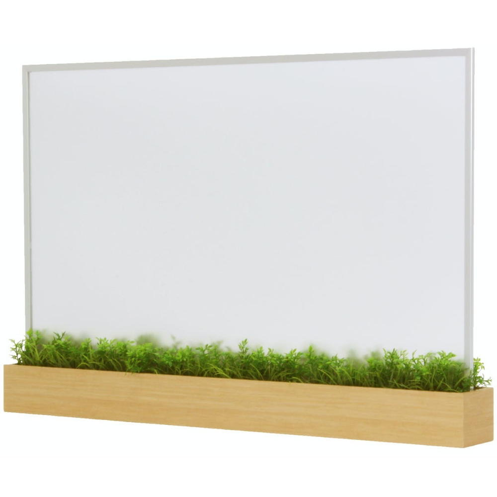- 造花が植わった木目調のポットの上に飛沫感染防止用のアクリル板が付いている卓上間仕切りスタンド。