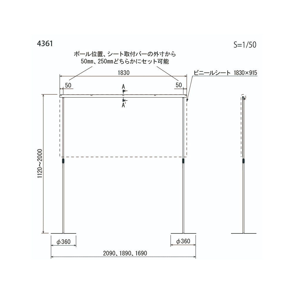 - W1830(上部バー)×H1120~2000×DΦ360mm