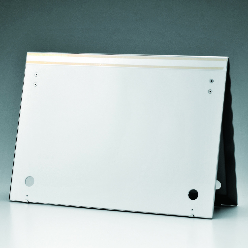 - 裏面の左右2箇所のから指を差し込み、透明板を受けから外します。