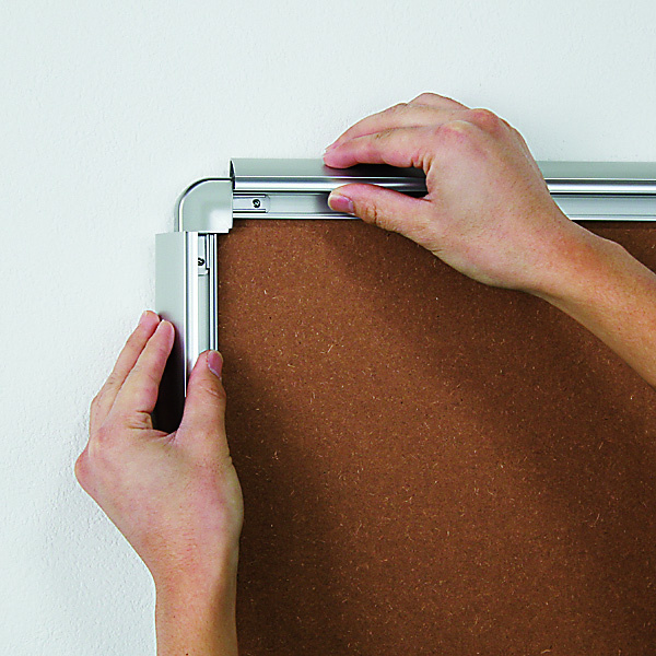 - ポスターと透明板の角を、フレームコーナーの内側に引掛けてセットします。