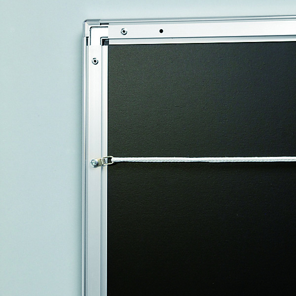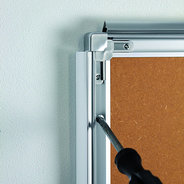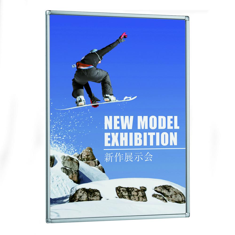 - ポスターと透明板の角を、フレームコーナーの内側に引掛けてセットします。