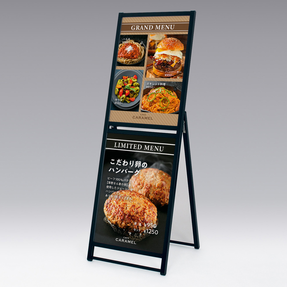 縦に2段ポスターフレームが付いた画期的な4パカオープン式の片面ポスタースタンド