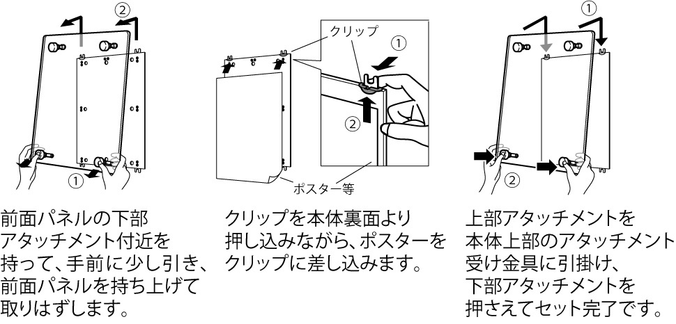 - 透明カバー脱着式。仮止めクリップ付きでポスターを簡単にセット出来ます。
