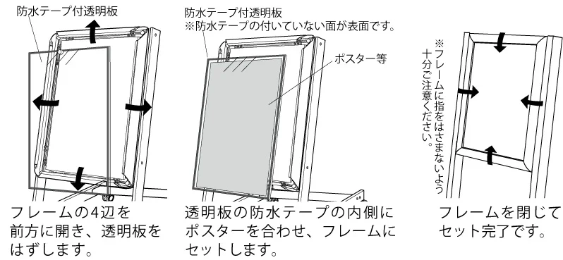 - オープンフレーム式なので、簡単にポスターの交換ができます。