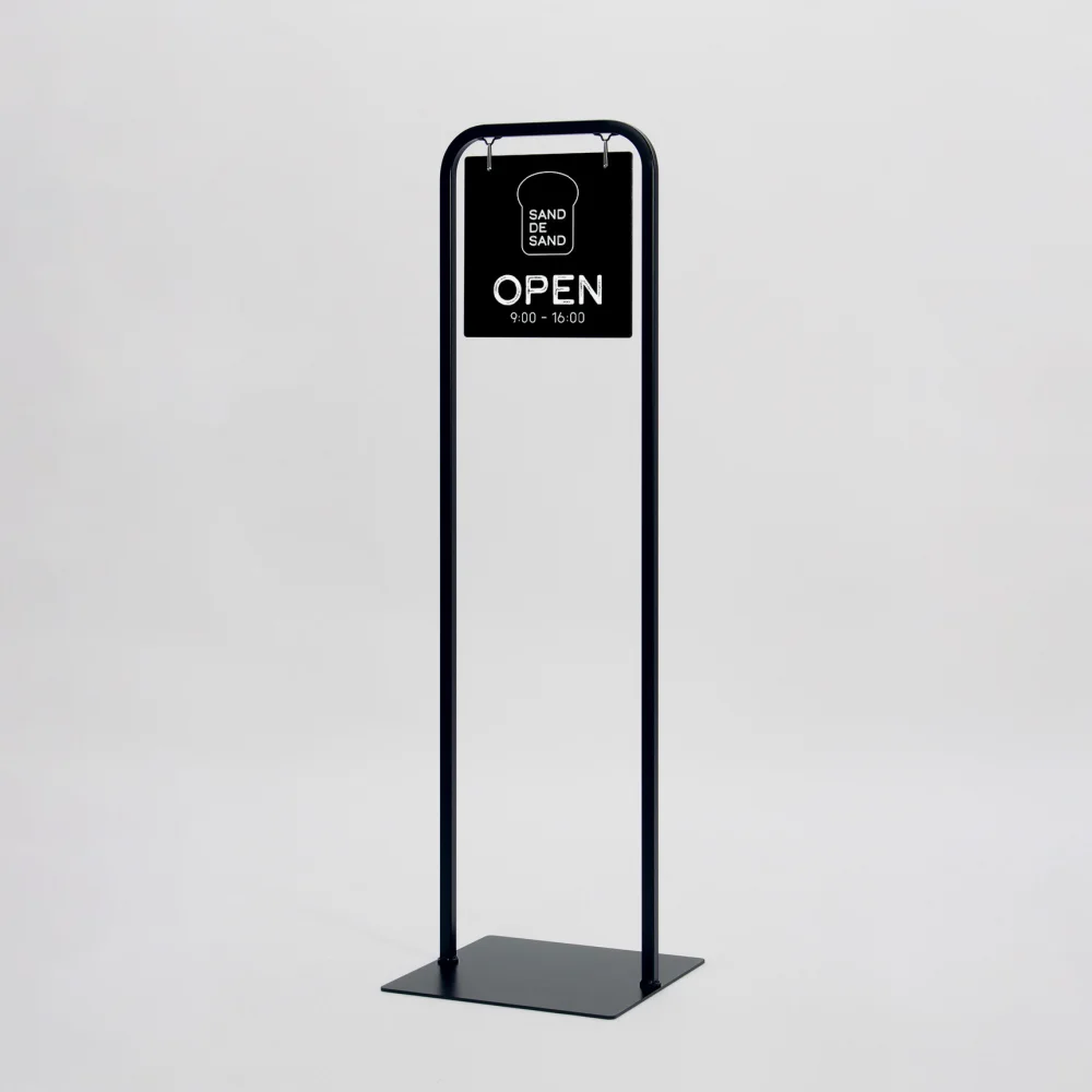 - 面板には3mmアルミ複合板を採用。しっかりとした厚みで、店名やロゴ、案内表示などをきれいに掲示できます。両面仕様なので、通路の両方向からの視認にも対応します。