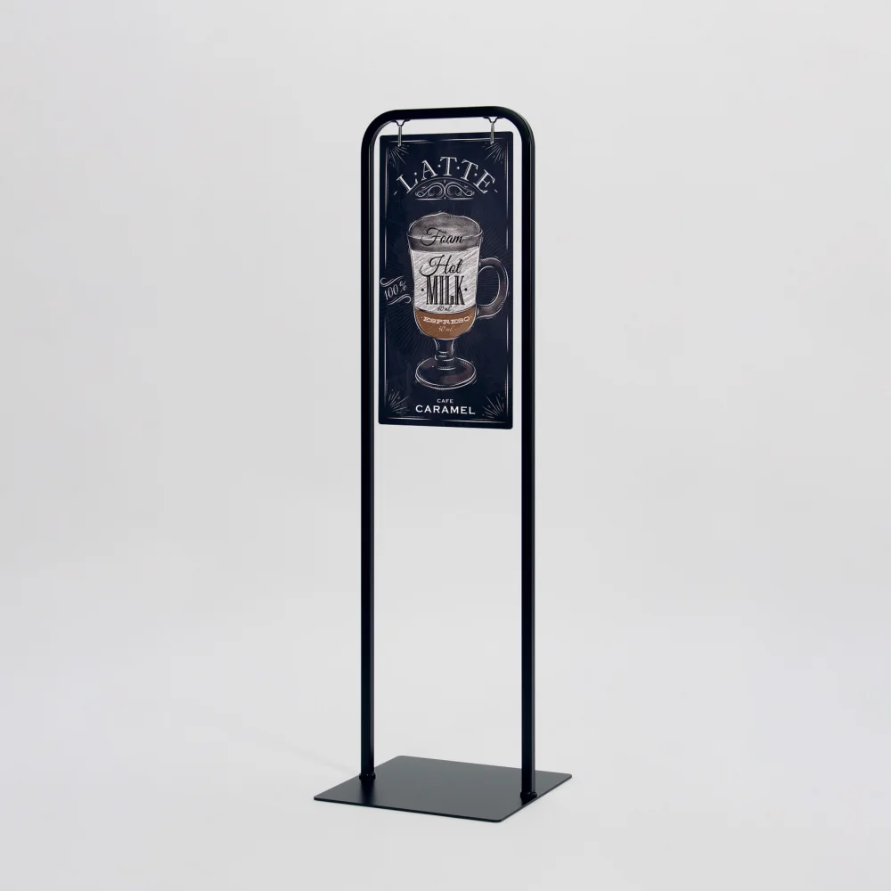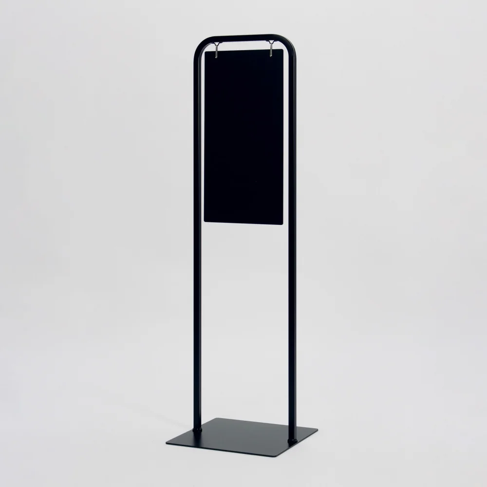 スリムシルエットのT型サインスタンド。無駄を削ぎ落としたデザインが空間に馴染み、表示を引き立てます。