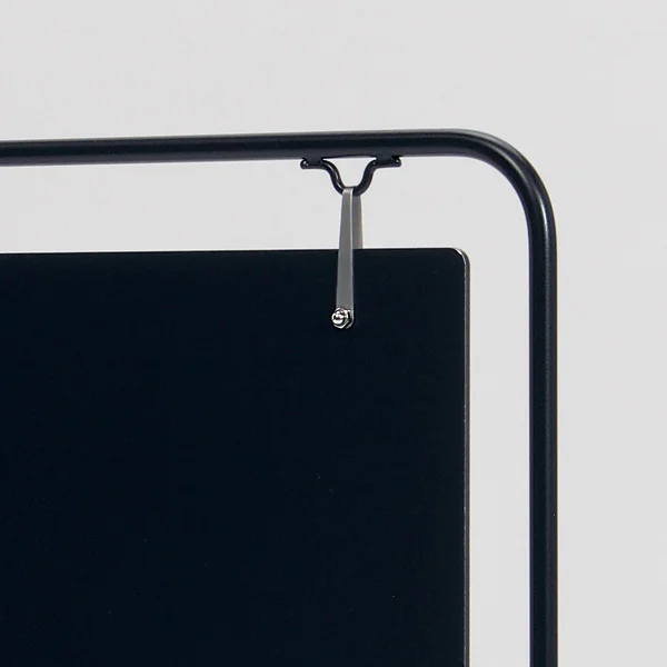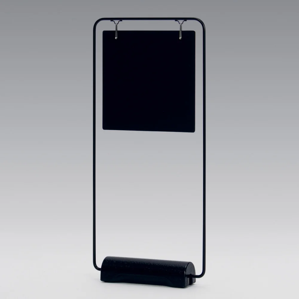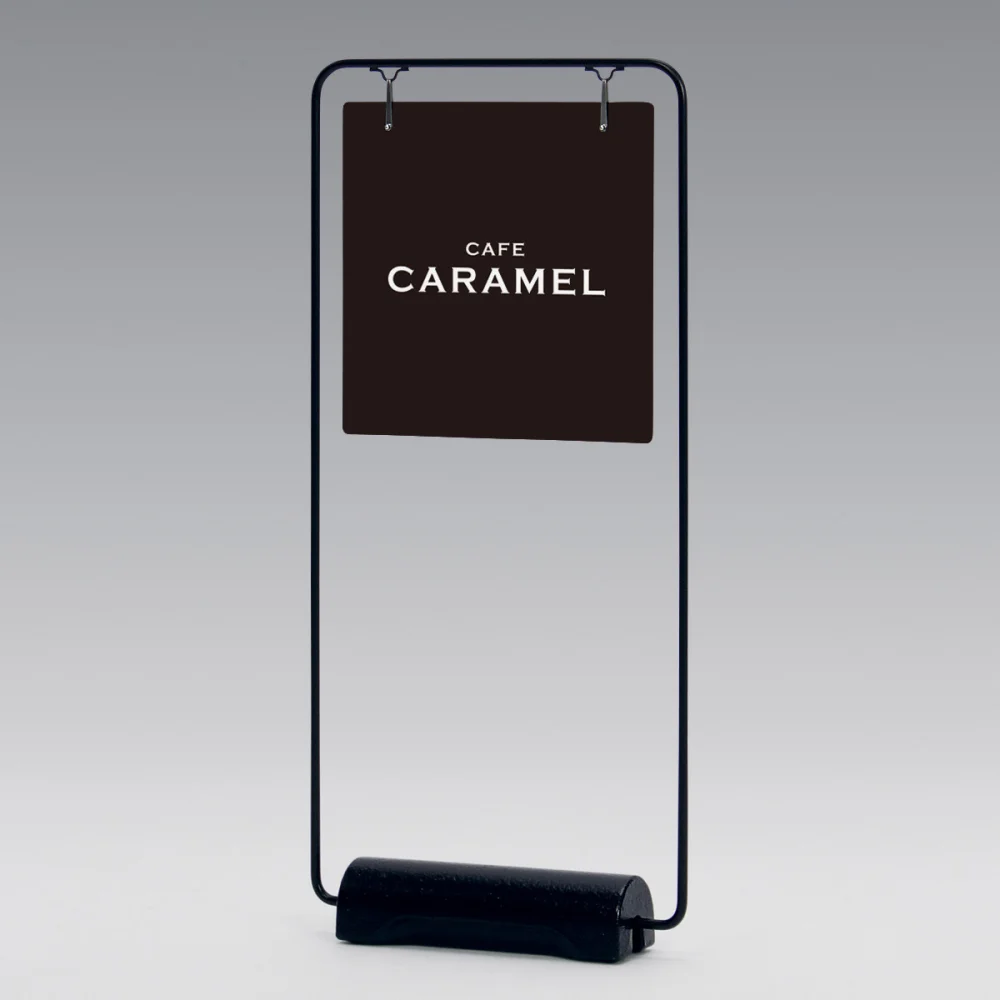 - シンプルな線材フレームに鋳造アイアンのウエイトベースを組み合わせた、屋外対応のスタンド看板です。