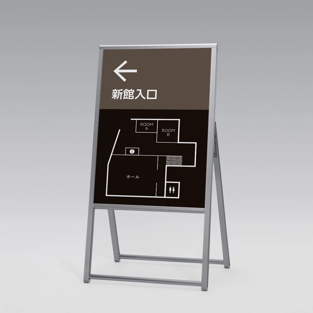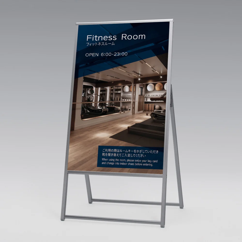 - 店舗の入口案内、施設内の誘導サイン、フィットネスルームやオフィスの案内表示など、壁際に設置する片面表示の看板として幅広くお使いいただけます。