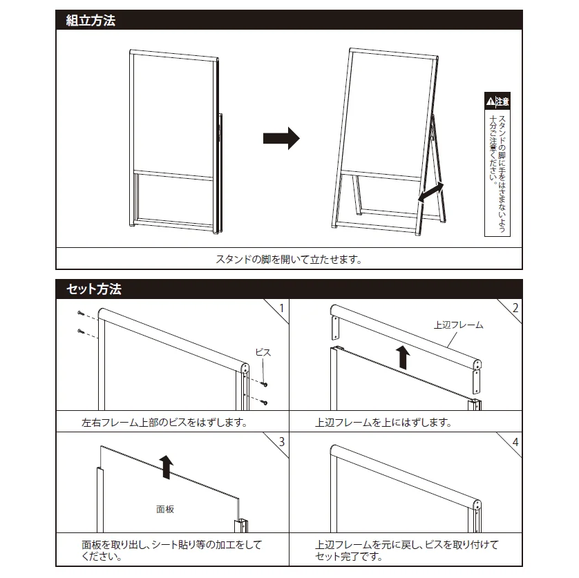 - アルミのスリム枠でも剛性十分。丈夫で長持ちするので、日常的な案内看板として長くお使いいただけます。