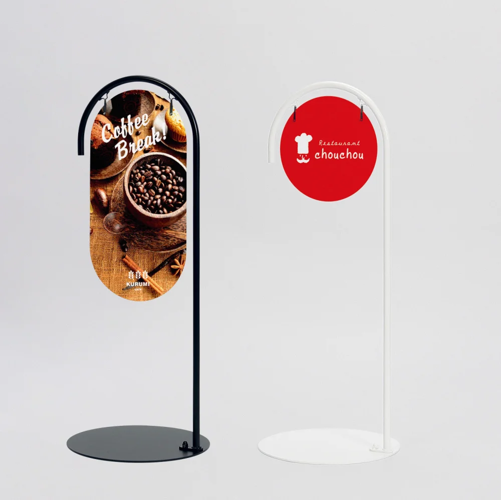 - 丸みのあるシルエットが印象的な、フラッグ型サインスタンドです。