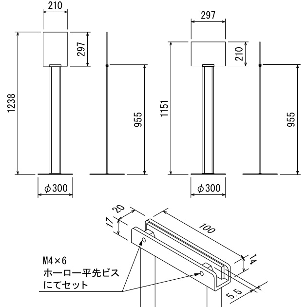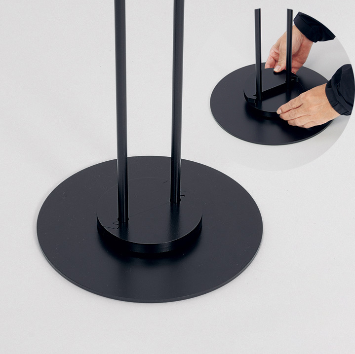 - ポール・ベースはスチール塗装仕上のブラックカラー。モダンでスタイリッシュな佇まいが、商業施設や公共施設、オフィスなど幅広いシーンにマッチします。組立式。