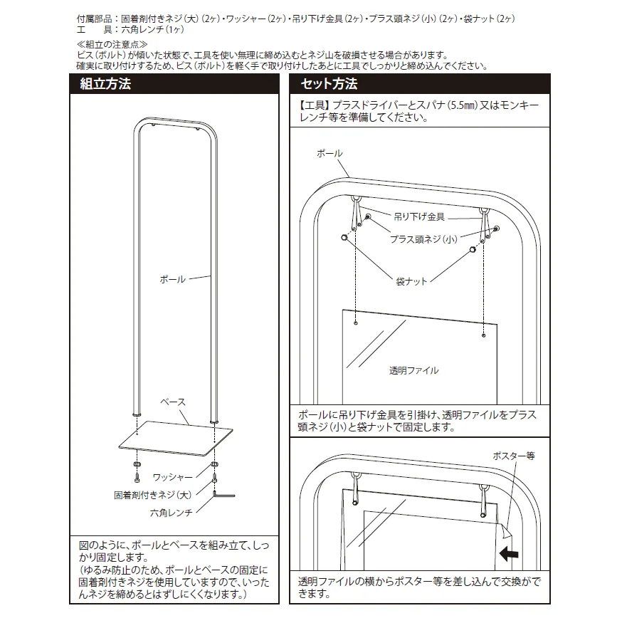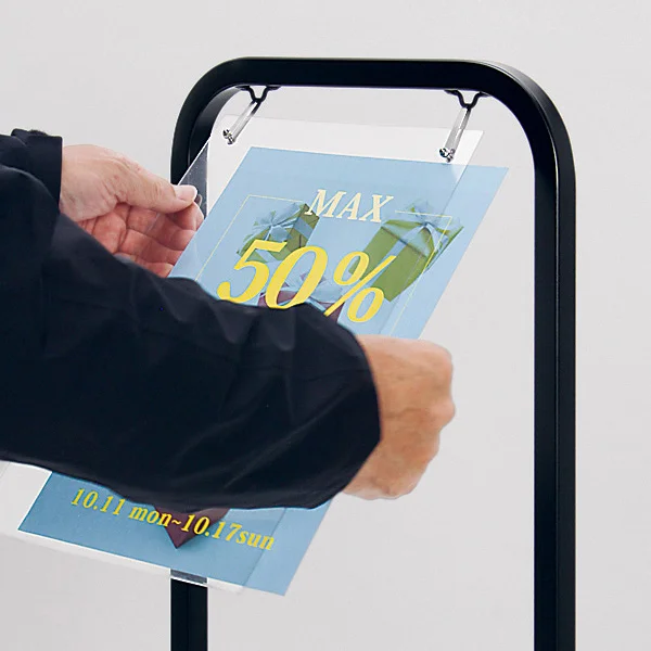 - 空間に馴染みながら表示を引き立てるデザインが魅力。透明ファイルの横からポスター等を差し込んで交換できるので、タイムリーな告知やこまめな情報更新に最適です。