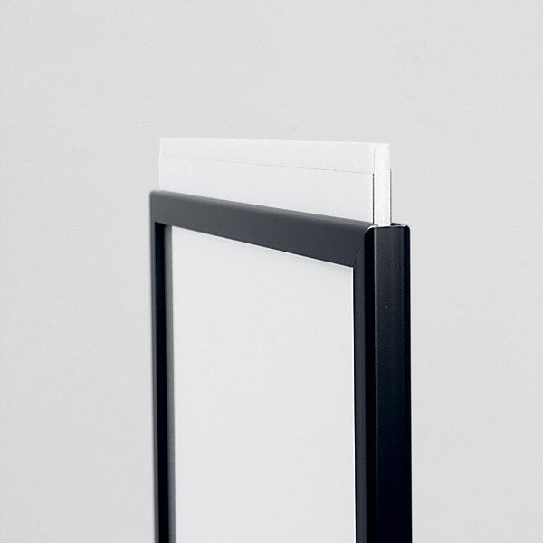 - 上部開口からスライドして中身を取り出し、透明板と裏板にソフトをはさんでセットするだけ。プリント出力した紙を手軽にセットでき、表示の差し替えもスムーズです。
