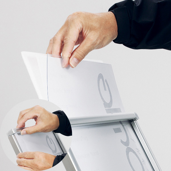 - ソフトの差し替えは1辺開口のスライドセット式。パネル表面の一辺を手前に引き出し、透明板と裏板にソフトをはさんでスライドして戻すだけの簡単操作です。