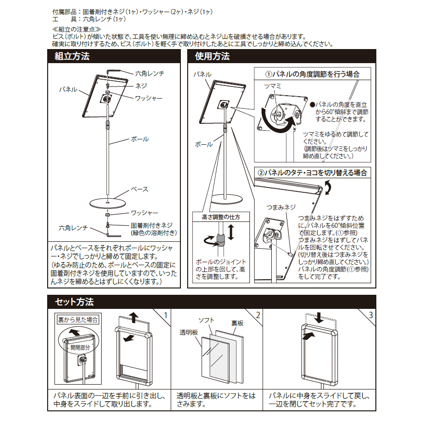 - オフィスの案内掲示、公共施設のフロア誘導、店舗のメニュー掲示など、日常使いにちょうどいいスタンドです。