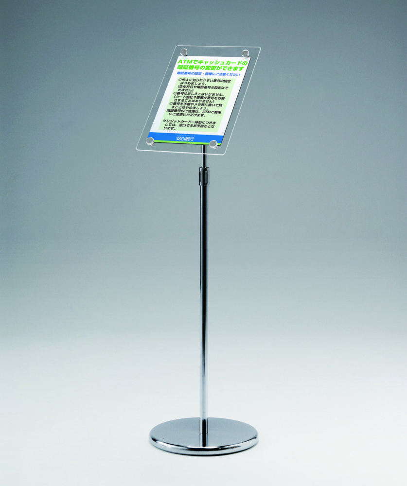 高さ・角度の調整が可能。クリアなデザインが新鮮なメッセージスタンド。フレームレスで表示がキレイに引き立ちます。ショールームなどでの展示案内におすすめ。
