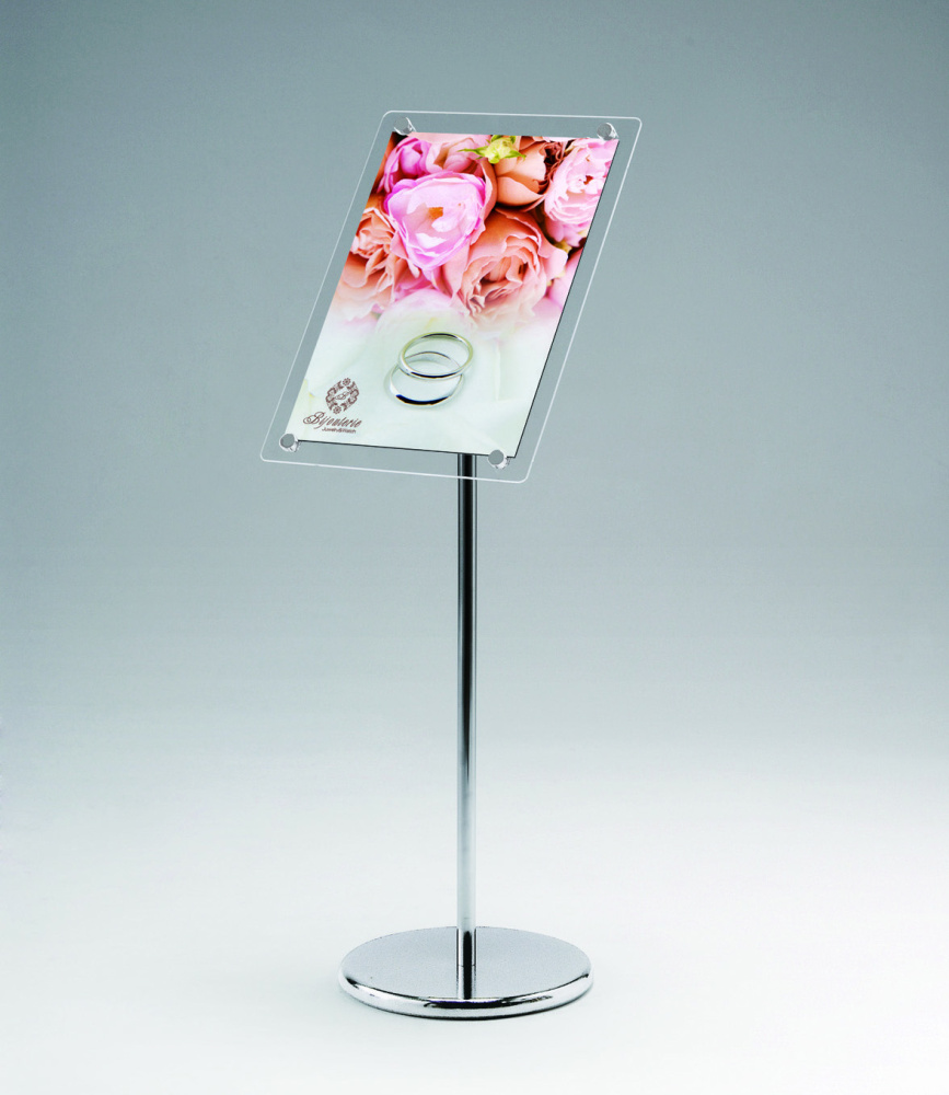 高さ・角度の調整が可能。クリアなデザインが新鮮なメッセージスタンド。フレームレスで表示がキレイに引き立ちます。ショールームなどでの展示案内におすすめ。