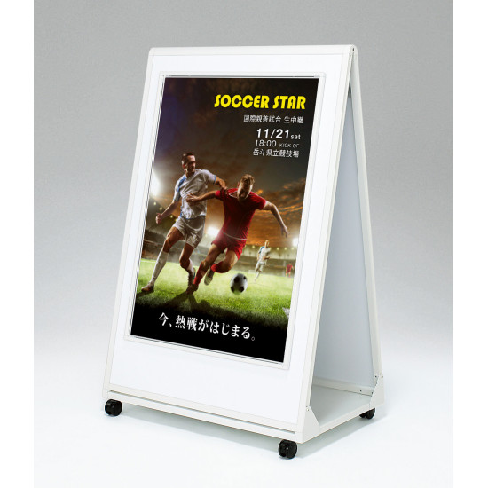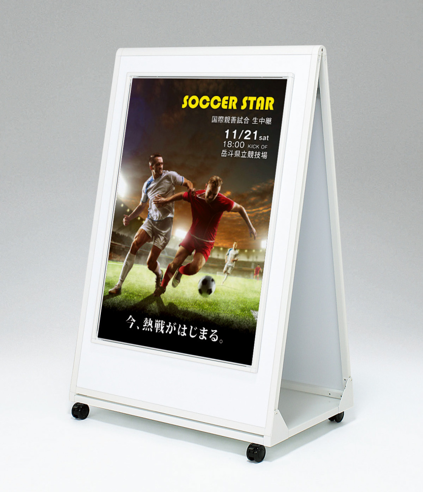 ガッチリ・安定、キャスター付きでそのまま移動可能。オープンフレームと一体型のポスタースタンド。商業施設・大型展示場のサイン・催事案内におすすめ。