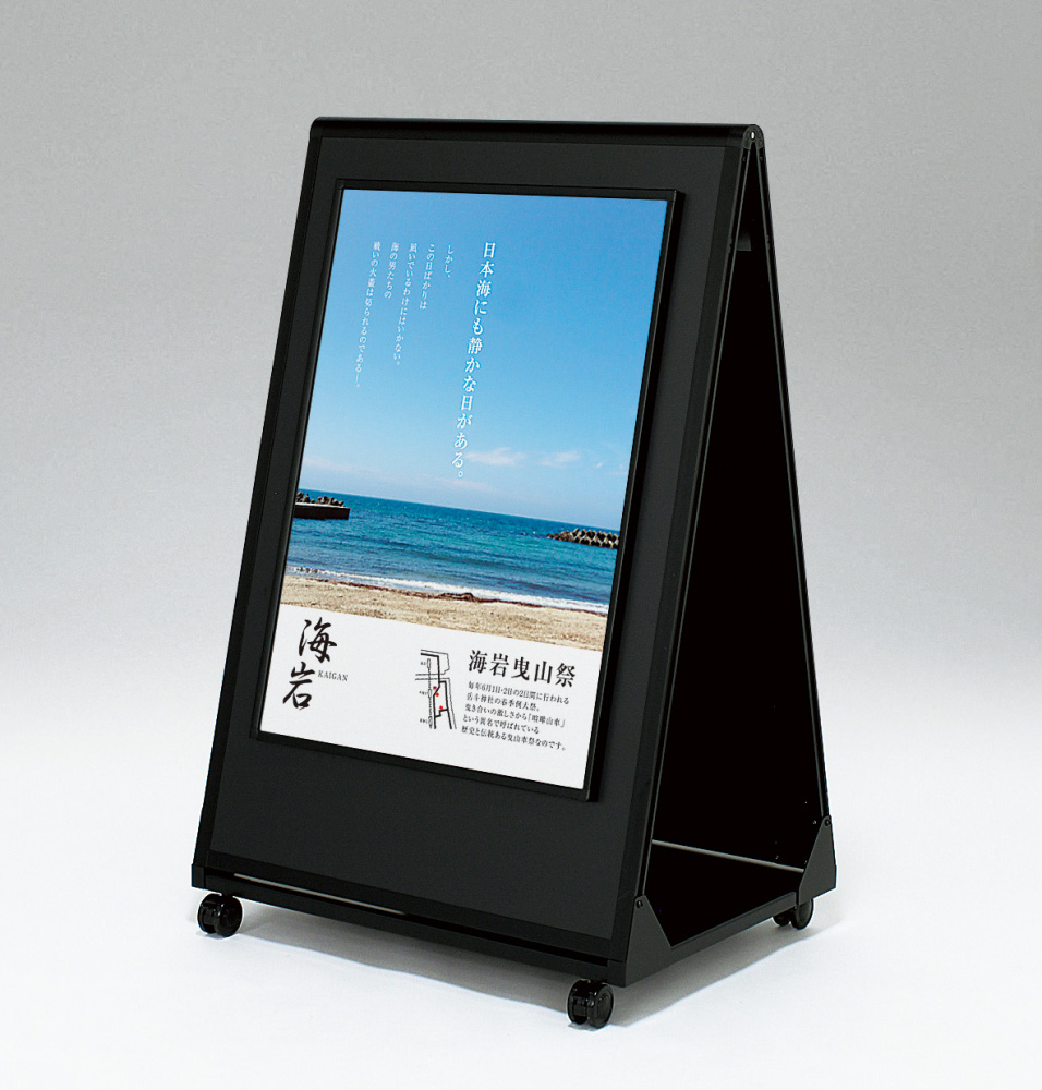 ガッチリ・安定、キャスター付きでそのまま移動可能。オープンフレームと一体型のポスタースタンド。商業施設・大型展示場のサイン・催事案内におすすめ。