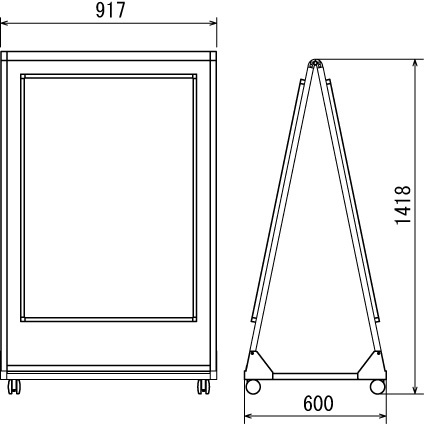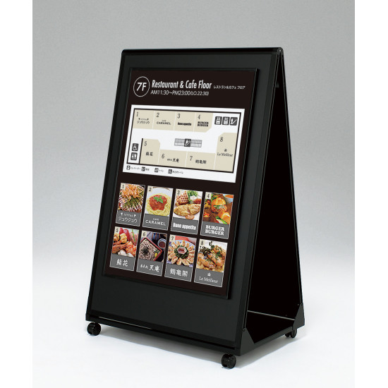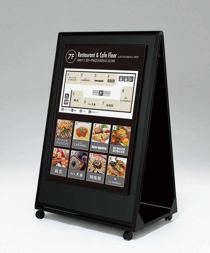 ガッチリ・安定、キャスター付きでそのまま移動可能。オープンフレームと一体型のポスタースタンド。商業施設・大型展示場のサイン・催事案内におすすめ。