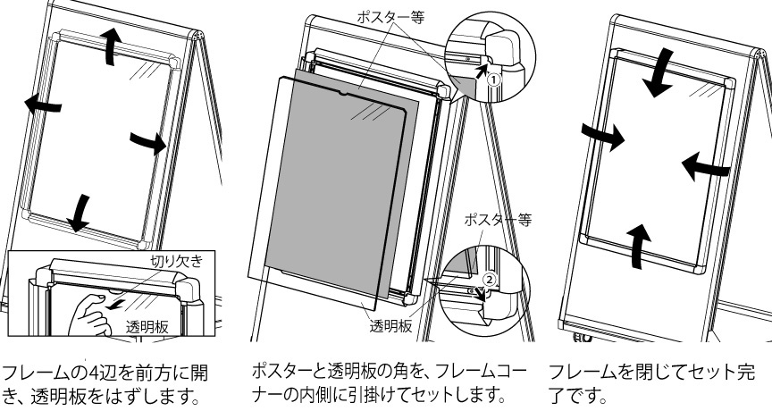 安定感のあるA型両面大サイズポスタースタンド。公共空間や人通りのある通路で、安定設置させたい場合におすすめです。 -