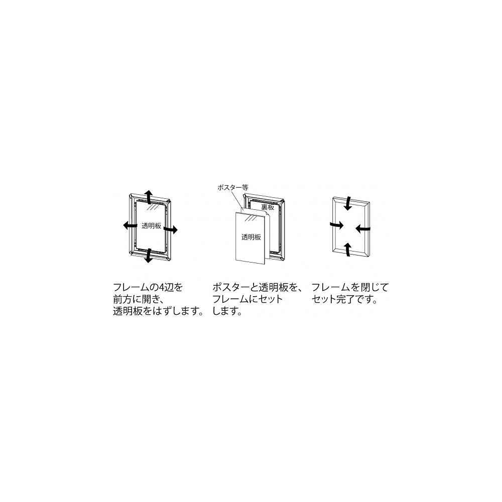 会社の展示室用にポスターパネルを購入しました。以前使用していたものよりも頑丈でありながら、ポスターの差し替えが簡単に出来る仕様で満足しています。以前のパネルはフレーム強度が弱い上に裏面の補強も弱く、ポスターがたわんで来るものでした。ポスターの差し替えも、手間がかかりました。このパネルはとにかくしっかりしていて、4面のプレームと壁側面によりしっかりとホールドされています。