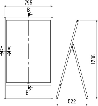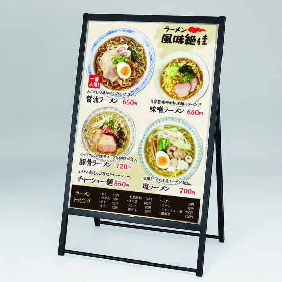 2枚のパネルを内蔵した、けんどん式ポスタースタンド。3種のポスターの入れ替えが簡単に行えます。タイムサービスメニューやイベント案内におすすめ。