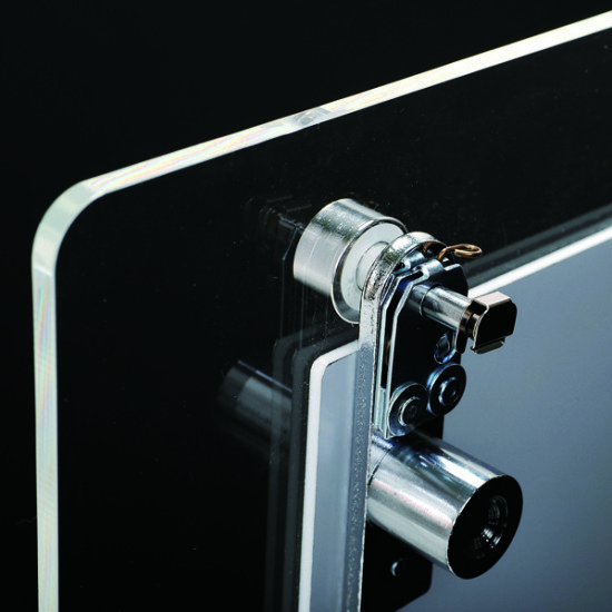 クリアな透明アクリルが斬新なアタッチメント式フレームレスパネルが空間イメージアップに役立ちます。