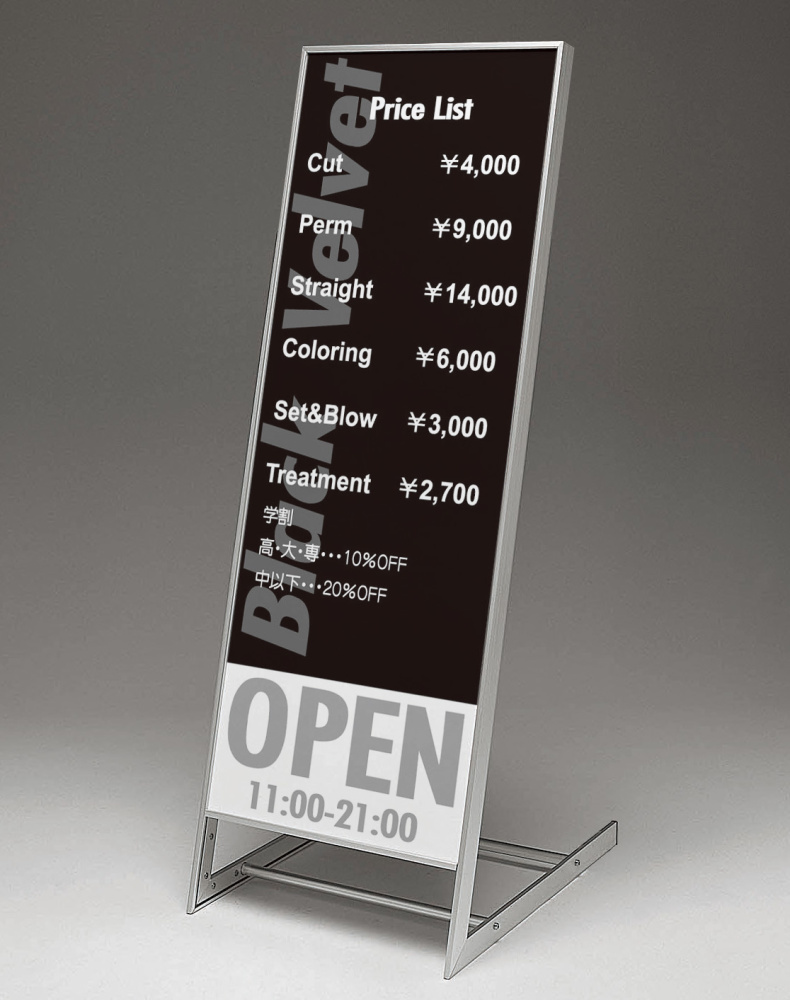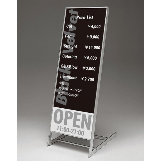 スリムでシャープなデザインが印象的。ヘアーサロンの店名看板やカットメニューにおすすめ。傾斜スタイルが店頭での入店促進に効果的。