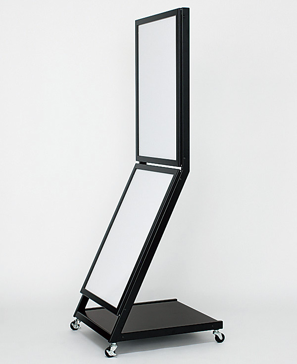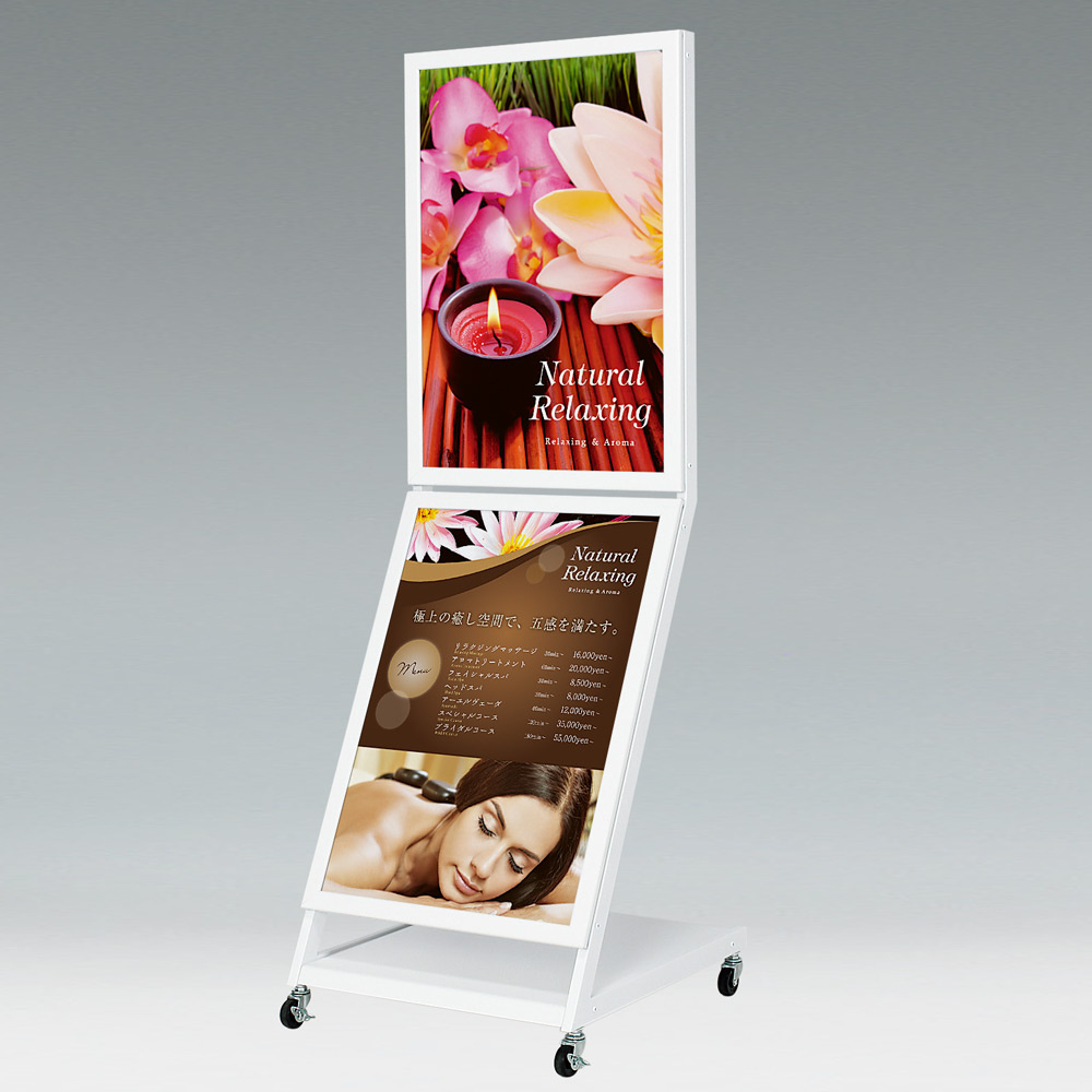 上下2段掲示の屋外用ポスタースタンド。4パカオープンフレームでポスター交換ラクラク。飲食メニューや商業施設のイベント案内におすすめ。