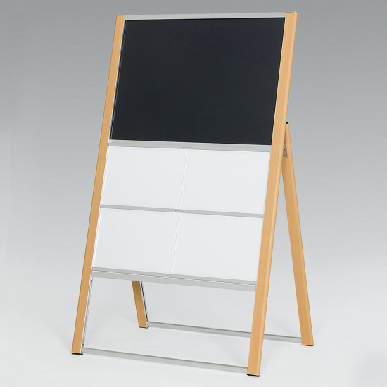 マーカー面はマグネットが使えるので、手書きの案内とA2までのポスター掲示が可能。付属のA4クリアケースにメディアをセットして使います。不動産の物件案内の他、店舗やショールームの入口案内にも使えます。上質感のある木目の支柱が案内を一層引き立てます。