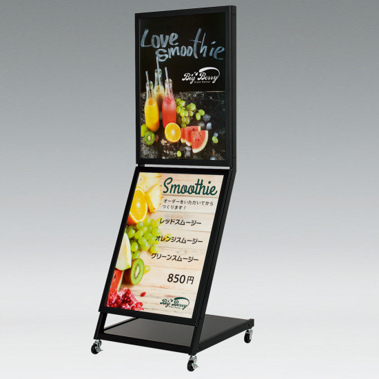 上下2段掲示の屋外用ポスタースタンド。4パカオープンフレームでポスター交換ラクラク。飲食メニューや商業施設のイベント案内におすすめ。