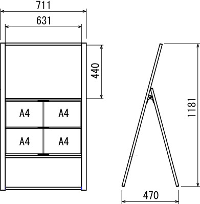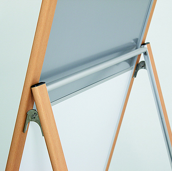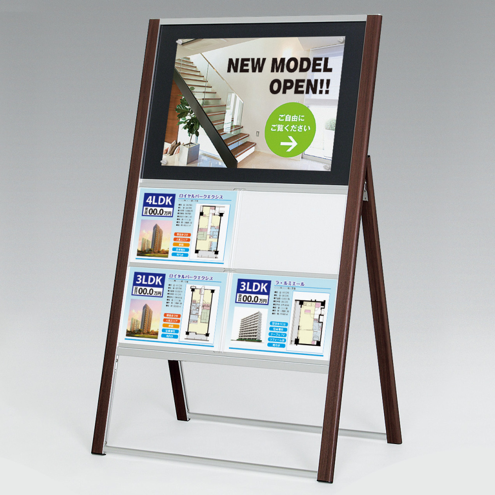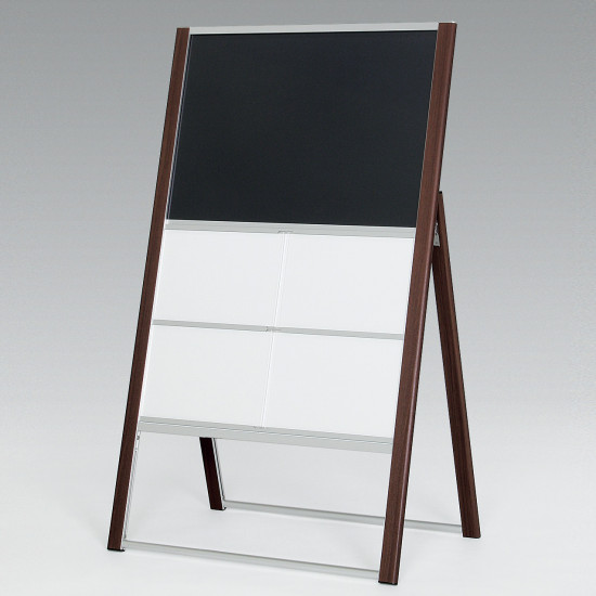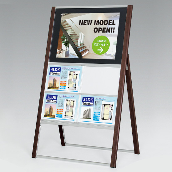 マーカー面はマグネットが使えるので、手書きの案内とA2までのポスター掲示が可能。付属のA4クリアケースにメディアをセットして使います。不動産の物件案内の他、店舗やショールームの入口案内にも使えます。上質感のある木目の支柱が案内を一層引き立てます。