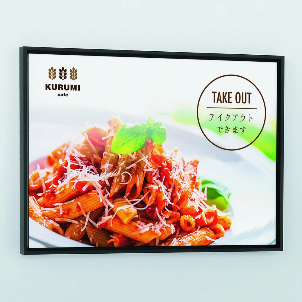 フレームを4辺開閉するスタンダードなパネルです。高級感があり、洗練されたイメージにピッタリです。 - 設置方法:直付け・壁掛け・吊り下げ(※B1以下でお願いします。)・スタンド