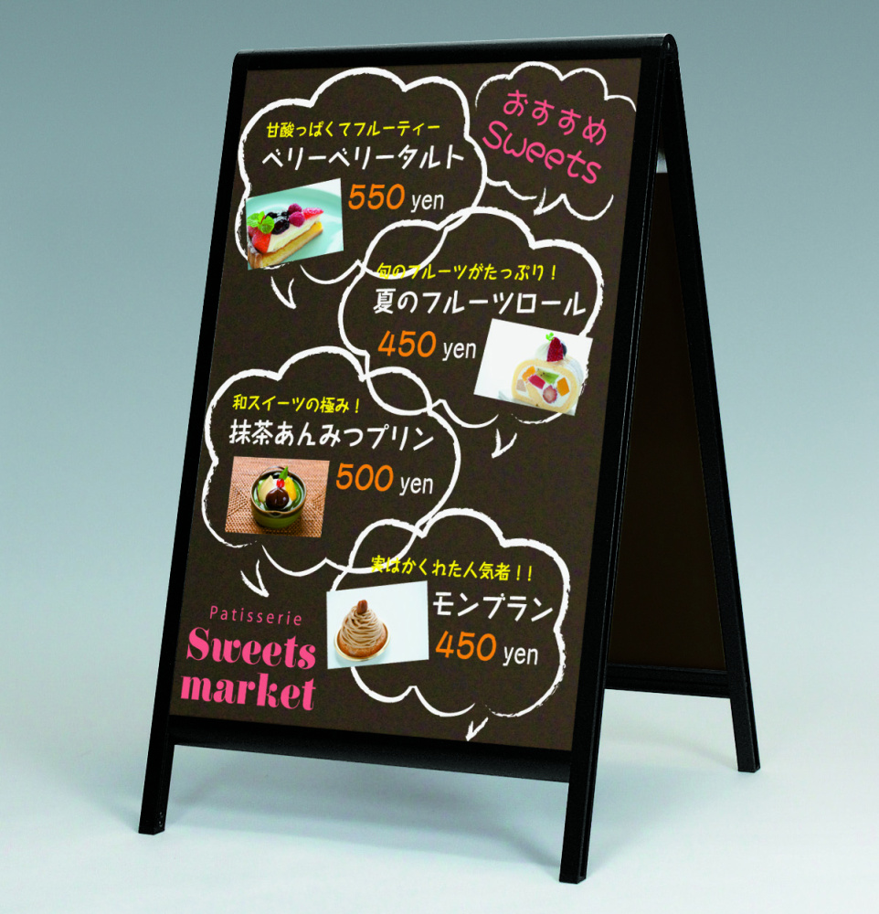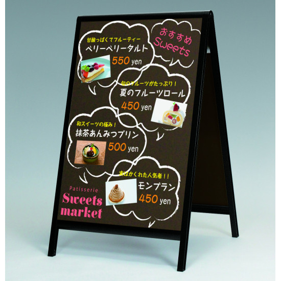 アールデザインが特徴のスタイリッシュな両面使えるマーカースタンド。おしゃれなカフェ・アーバンファッションの店頭にピッタリ。マグネットも使えます。600×900はB2ポスターをセット可能。