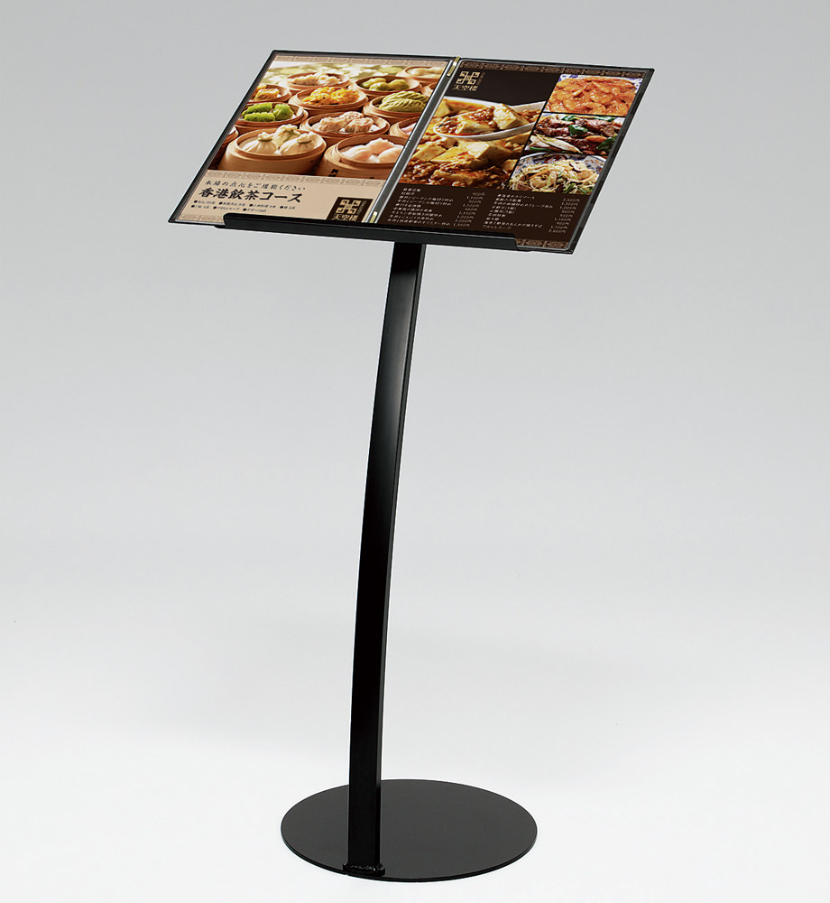 Rデザインが斬新なメニュー載せスタンド。ヘアーサロン・リザクゼーション等のサービスメニュー案内にもおすすめ。豊富なオプションで営業案内や待ち時間表示等の情報追加が可能です。