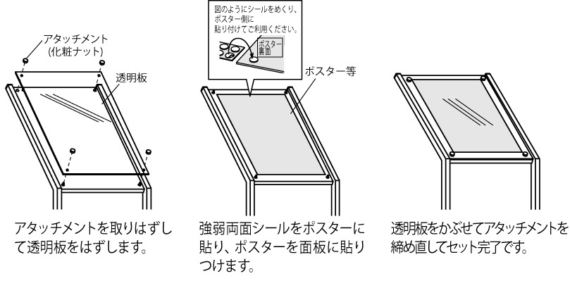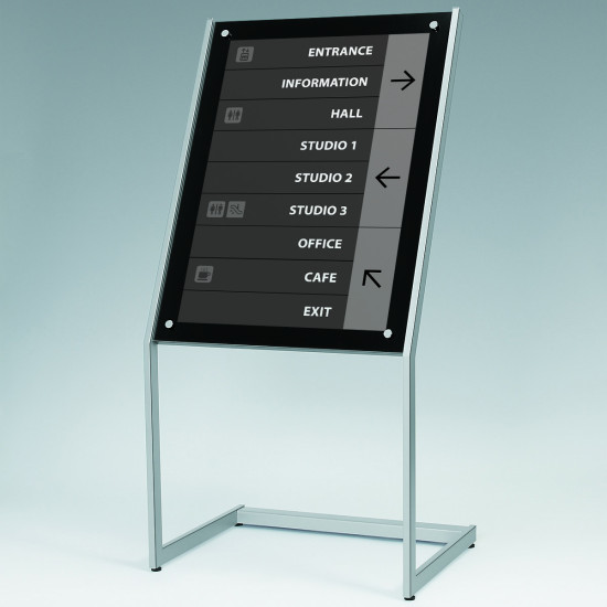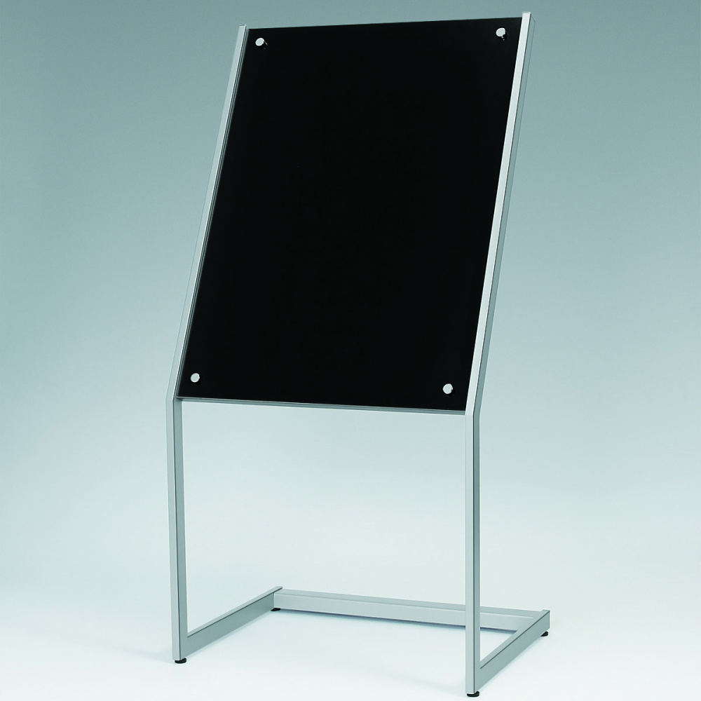 フロア案内・営業案内に適したインフォメーションスタンド。スタンダードなアタッチメントスタイル。黒バックボードがポスターを引き立てます。