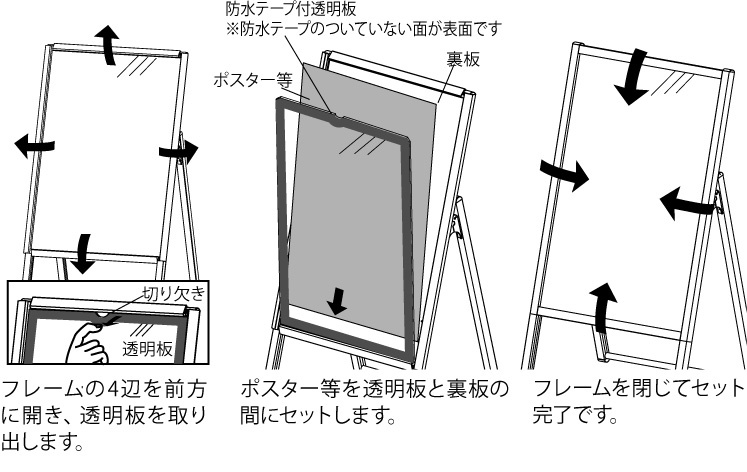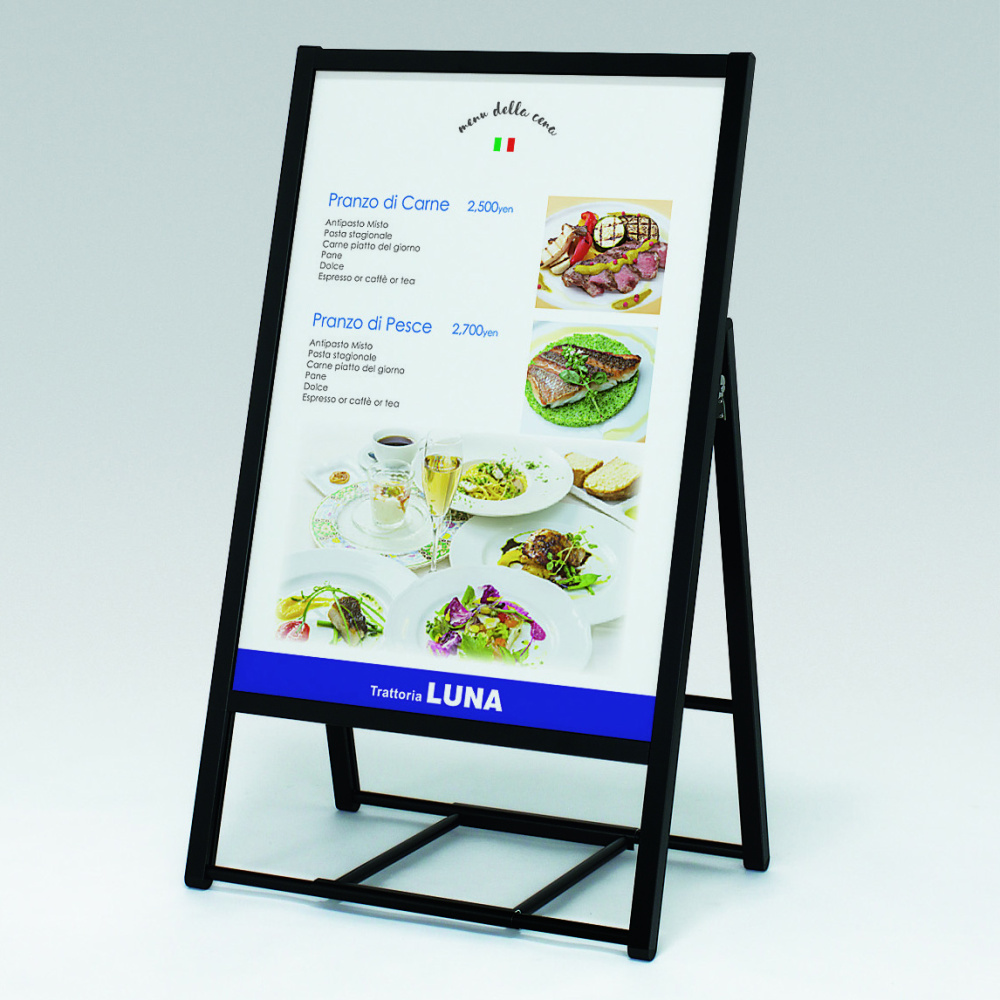 屋外で使える簡易防水仕様。画期的な4パカオープン式の両面ポスタースタンド。スタンド自体が開閉する機能的でシンプルなデザイン。