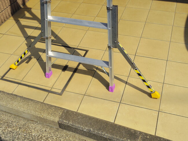 - 脚立の両側にセーフティライダーの補助脚が開き、抜群の安定性を生み出します。