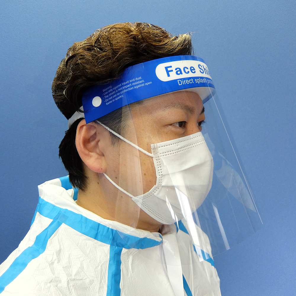 超軽量で簡単装着。顔全体をカバーして、ウィルスや飛沫から守ります。